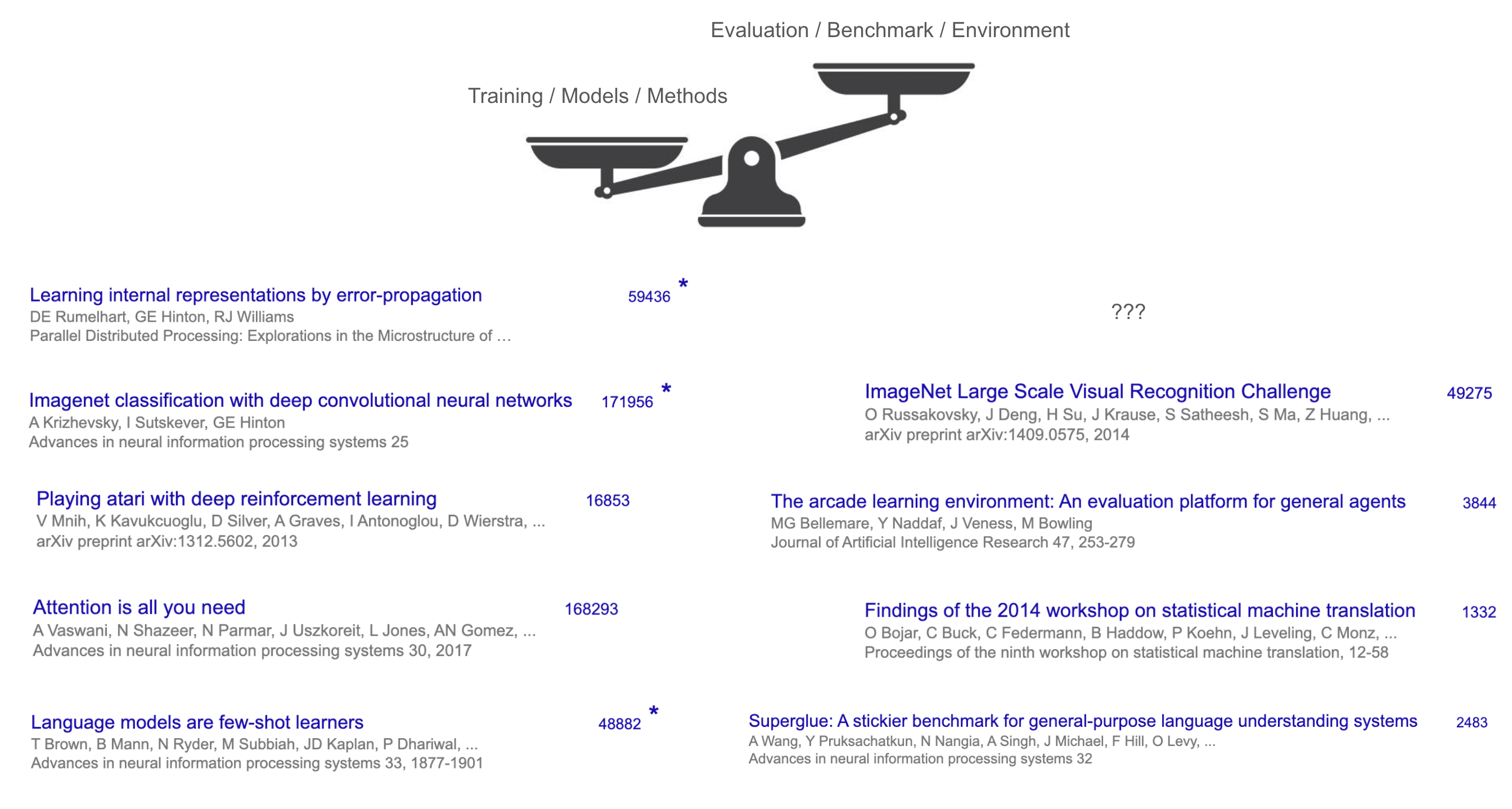 - 即使是最有影响力的基准测试 —— ImageNet —— 其引用量也不及 AlexNet 的三分之一。