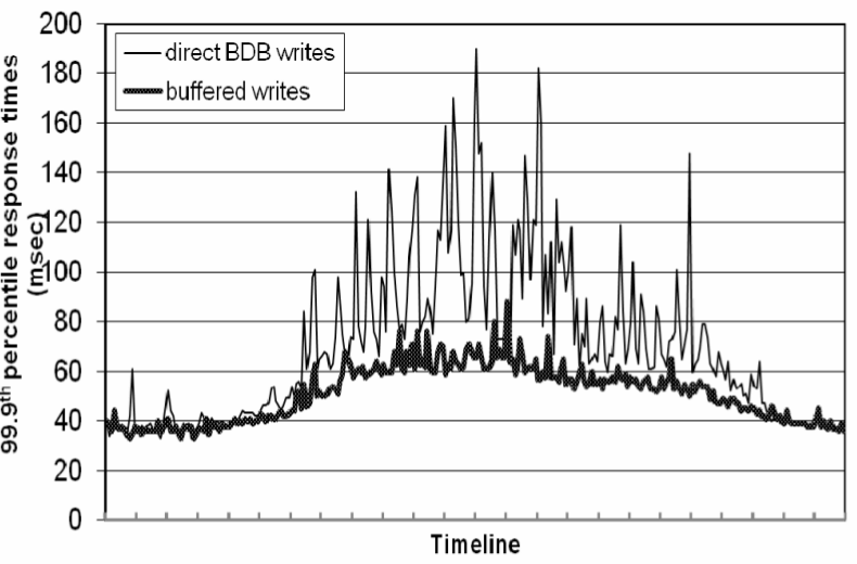 另外从表中还可以看出,平均延迟远远小于 P99.9。这是因为 Dynamo 的存储引擎缓存(