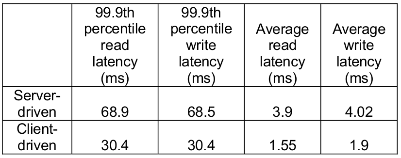 表 2 显示了客户端驱动比服务端驱动的 coordination 的性能提升,测量时间为 24 个小时。