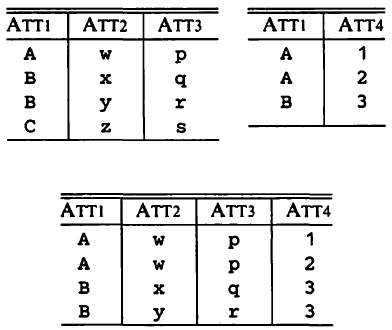 A natural join, or join for short, is an operator that combines two tables into one on the basis of their common attributes. The attributes of the resulting table are all the attributes of the two tables being joined, with duplicates removed.