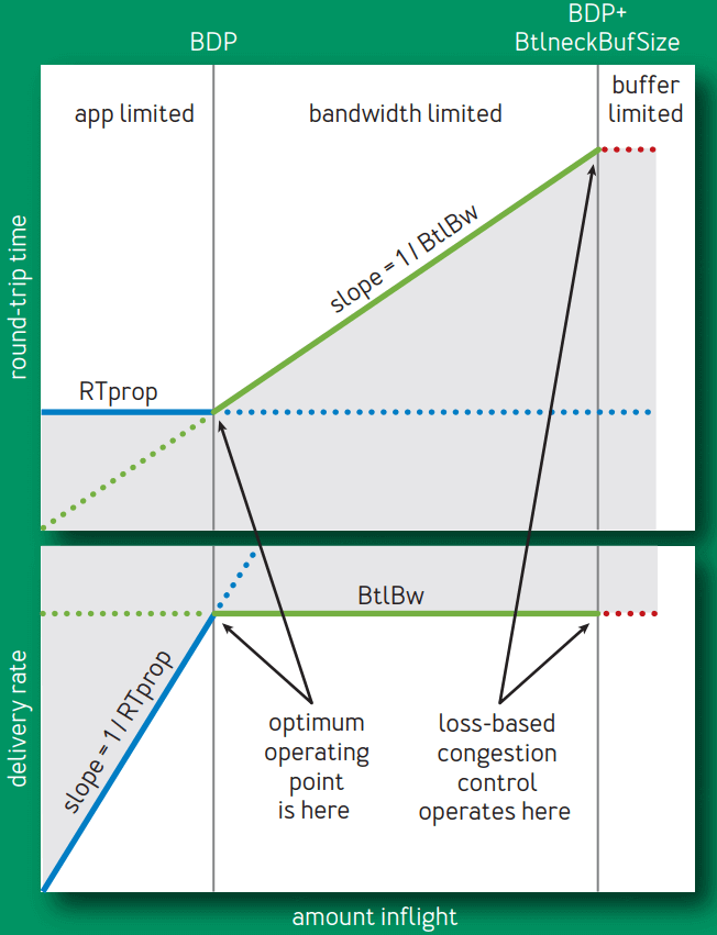 (0, BDP):这个区间内,应用(客户端)发送的数据并未占满瓶颈带宽(容量),因此称为 应用受限(app limited)区域;(BDP, BDP+BtlneckBuffSize):这个区间内,已经达到链路瓶颈容量,但还未超过 瓶颈容量+缓冲区容量,此时应用能发送的数据量主要受带宽限制, 因此称为带宽受限(bandwidth limited)区域;(BDP+BtlneckBuffSize, infinity):这个区间内,实际发送速率已经超过瓶颈容量+缓冲区容量 ,多出来的数据会被丢弃,缓冲区大小决定了丢包多少,因此称为缓冲区受限(buffer limited)区域。