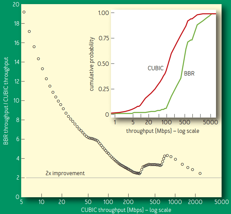 - 手动将 US-Europe 的一条路径上的接收缓冲区调大之后,BBR 立即达到了 2Gbps 的带宽 —— 而 CUBIC 仍然只能到达 15Mbps —— 133 倍的提升,正如 Mathis 等人的预测17。