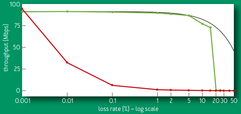 这巨大的提升是 BBR 没有将丢包作为拥塞指示器(not using loss as a congestion indicator)的一个直接结果。 为达到全速带宽,现有的基于丢包的拥塞控制,要求丢包率低于 BDP 的 inverse square 17 (e.g., 小于 one loss per 30 million packets for a 10-Gbps/100-ms path)