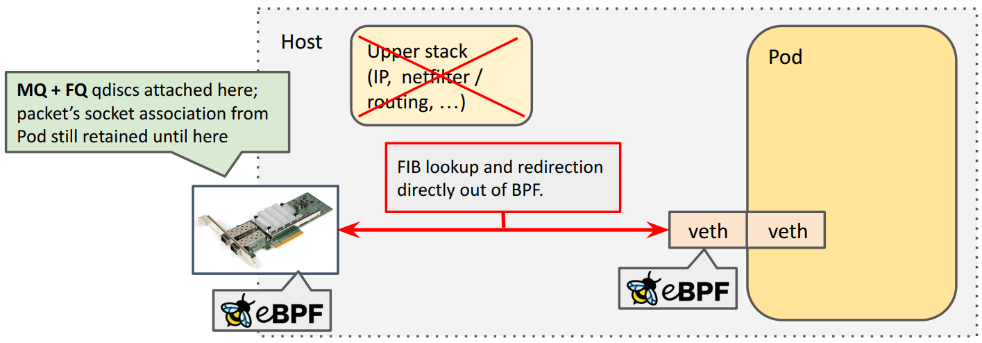- 不需要进入协议栈,Cilium 的 BPF host routing 功能,使得 FIB lookup 等过程完全在 TC eBPF 层完成,并且能直接转发到网络设备。