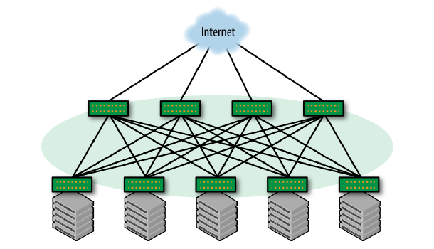 大型互联网公司最后采用了一种称为 Clos 的架构。Clos 架构最初是贝尔实验室的 Charles Clos 在 1950s 为电话交换网设计的。 CLOS 可以实现无阻塞架构(non-blocking architecture):上下行带宽都充分利用。