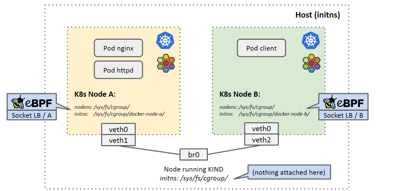 - cilium-agent 会将 BPF 程序加载到它的视角看到的 cgroup root 挂载点(即 k8s-node 中的