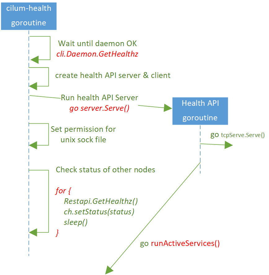 go ch.server.Serve(): start cilium-health API server in a new goroutine,- Spawn TCP servers goroutines