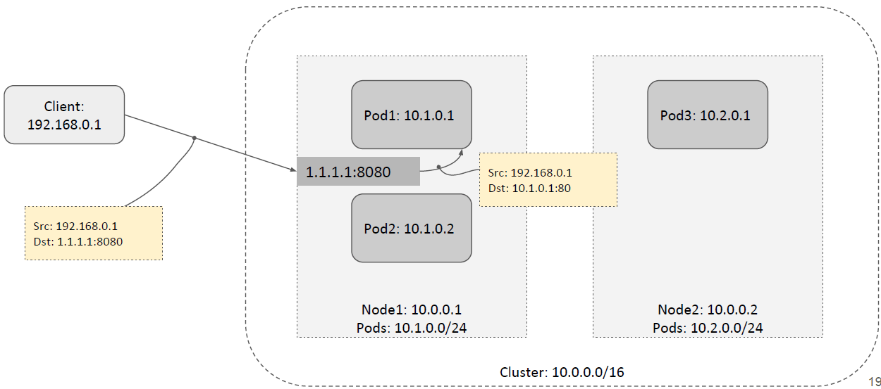 如下图所示,1.1.1.1 是一个 external IP,所有目的 IP 地址是 1.1.1.1 的流量会