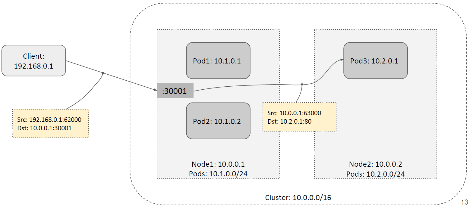 30001 端口时,它可以对请求做 DNAT 然后转发给本节点内的 Pod,如下图所示,