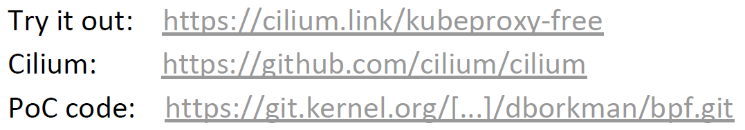 - kube-proxy IPVS 模式:性能更差一些,因为它的 per-packet overhead 更大一 些,这里测试的 Service 只对应一个 backend pod。当 Service 数量更多时, IPVS 的可扩展性更好,相比 iptables 模式的 kube-proxy 性能会更好,但仍然没 法跟我们基于 TC BPF 和 XDP 的实现相比(no comparison at all)。