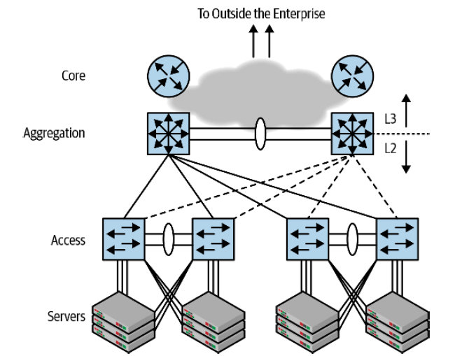图 1-2 是在上世纪末开始占据统治地位的网络架构:接入-汇聚-核心三级网络架构。