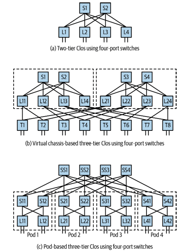 图 c:三层交换机都是独立设备,Spine 和 Leaf 组成 POD,再和上面的 SuperSpine 互连。