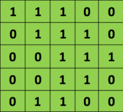 每个图像都是像素值组成的矩阵。考虑一个 5x5 的图像,其像素值只有 0 和 1(灰度图像的像素值范围为 0 到 255,这里我们进一步简化,像素值只有 0 和 1):