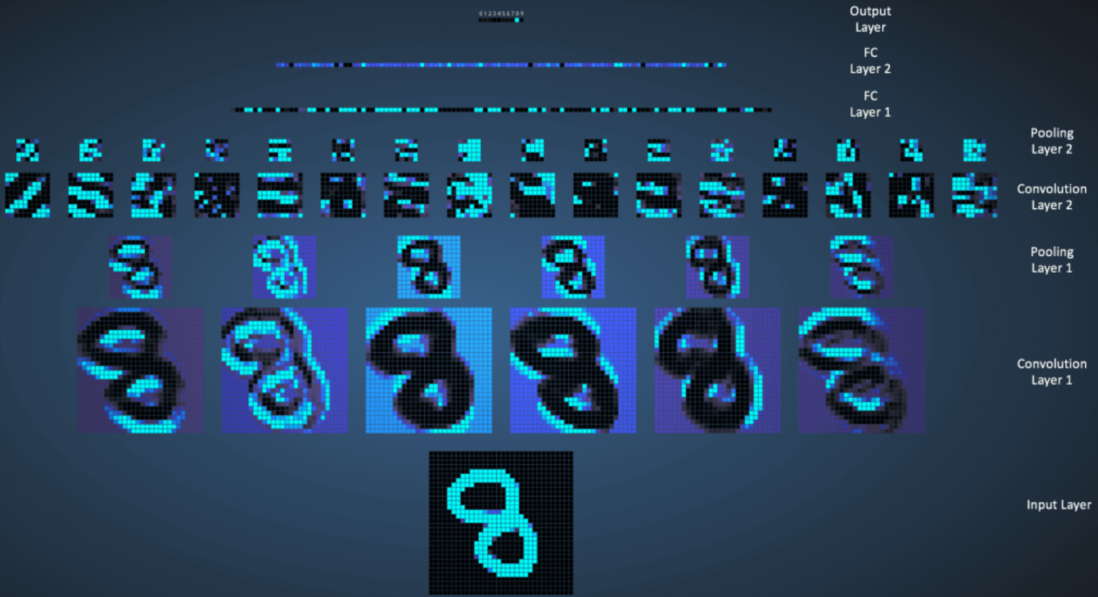 Adam Harley 在 MNIST 手写数字数据库 [13] 上训练卷积神经网络,创造了惊人的可视化效果。