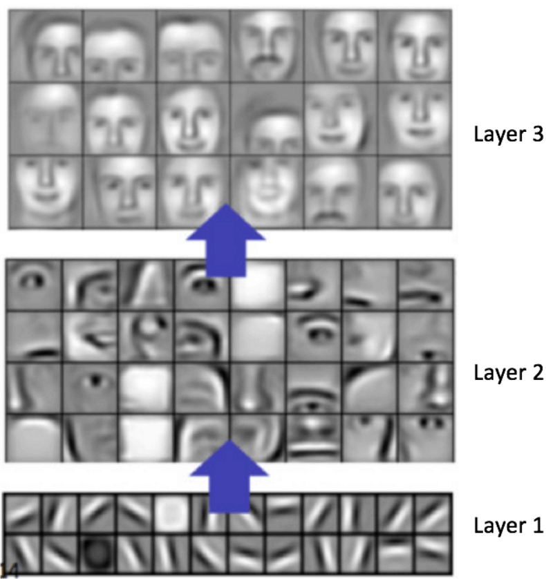 图 17:Convolutional Deep Belief Network 学习特征: 第一层检测边缘;第二次检测形状;第三张检测人脸。 Source [21]