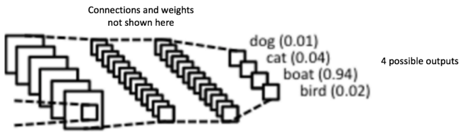 例如,假设我们的图像分类有四种可能,如下图所示(图中省略了全连接层中节点之间的连接),