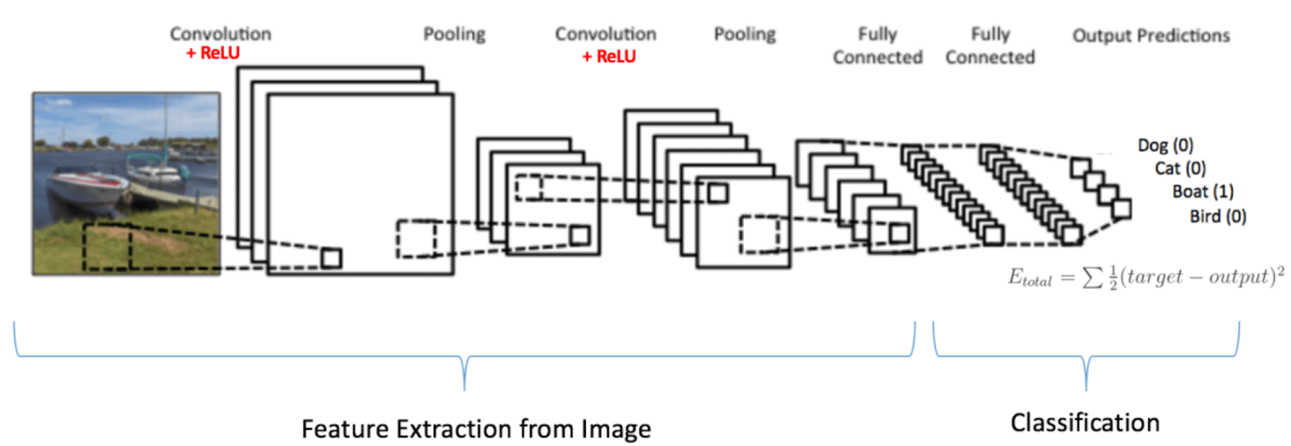 - 当再次输入相同的图像时,输出概率可能就是 [0.1, 0.1, 0.7, 0.1],更接近目标向量 [0, 0, 1, 0], 这意味着网络已经学会通过调整其权重/过滤器来正确分类该特定图像,从而减少输出误差。