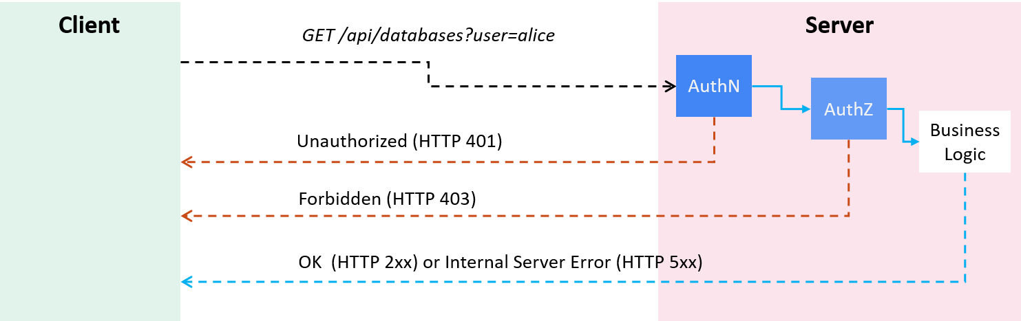 401 Unauthorized(a long-standing misnomer, "401 Unauthenticated" would be more appropriate); - Otherwise (authenticated): enter the next stage (AuthZ).
