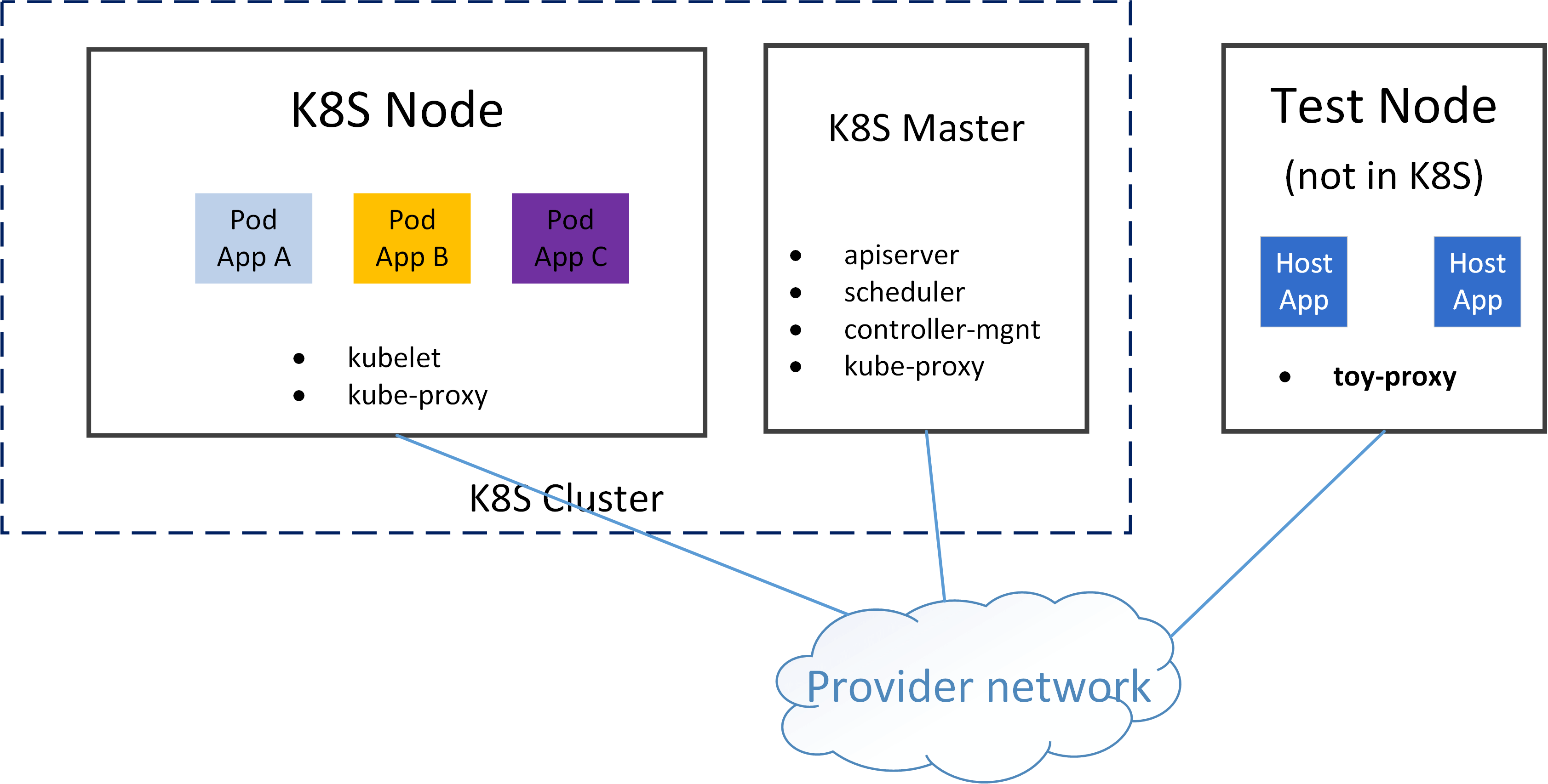 With our toy proxiers, applications (whether it’s a host app, or an app running inside a VM/container) on a non-k8s-node (thus not in K8S cluster) can also access K8S services with ClusterIP - note that in Kubernetes’s design, ClusterIP is only accessible within K8S cluster nodes. (In some sense, our toy proxier turns non-k8s-nodes into K8S nodes.)