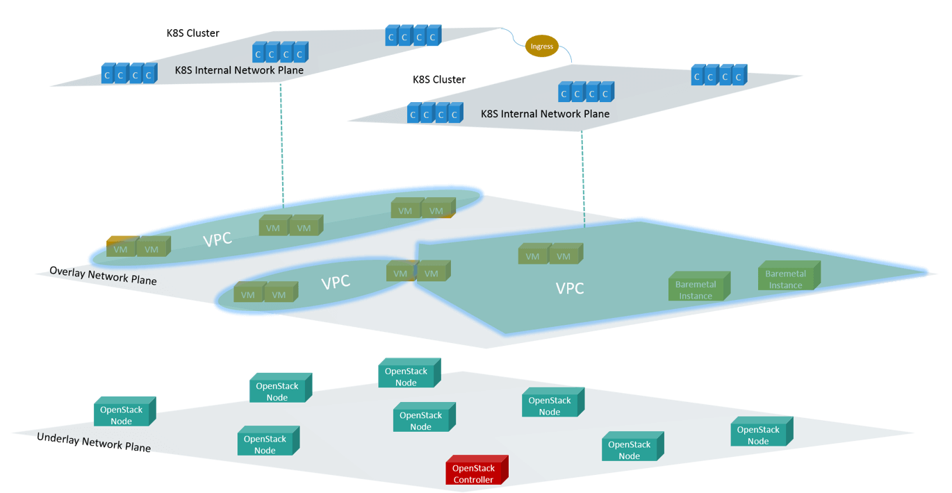 One K8S cluster will be kept within one VPC, and each cluster manages its own networks. All access via IP address should be kept within that cluster, and all access from outside of the cluster should go through Ingress - the K8S native way. We haven’t achieved this, because it needs lots of SW and HW system refactors.