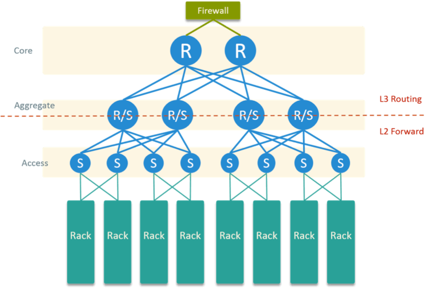 First of all, if you are familiar with data center networks you may know that hierachical network model is hard to scale.