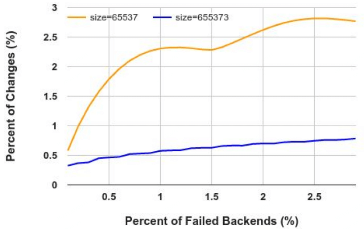 一致性哈希的一个核心特性是具备对后端变化的容错性(resilience to backend changes)。 当一部分后端发生故障时,其他后端的哈希表项不受影响(因此对应的连接及主机也不受影响)。 Maglev 论文中已经给出了评估这种容错性的指标,如下图,