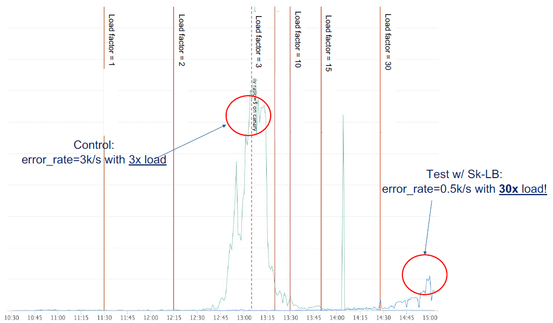 - 实验组(右边):30x,因此还没有到分发瓶颈但 CPU 已经用满了,但即使这样丢包仍然很少。