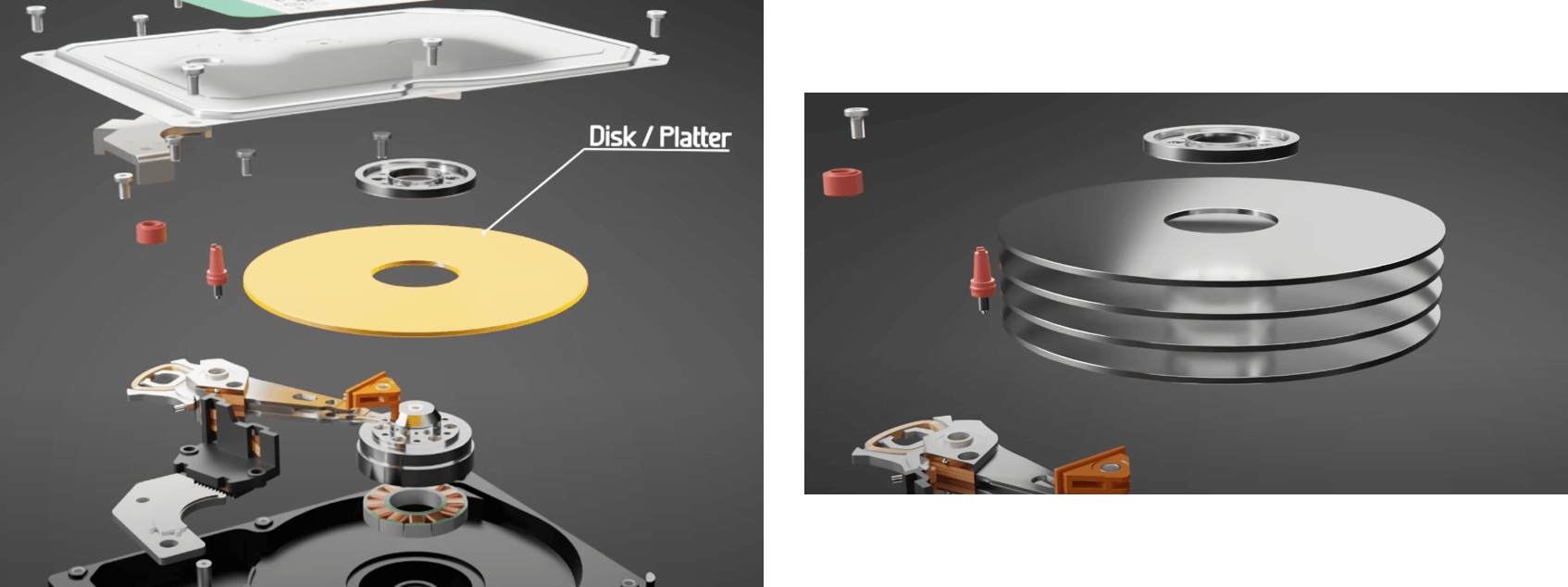- 根据存储容量的不同,硬盘可能会有多个盘片堆叠,如上面右图所示;