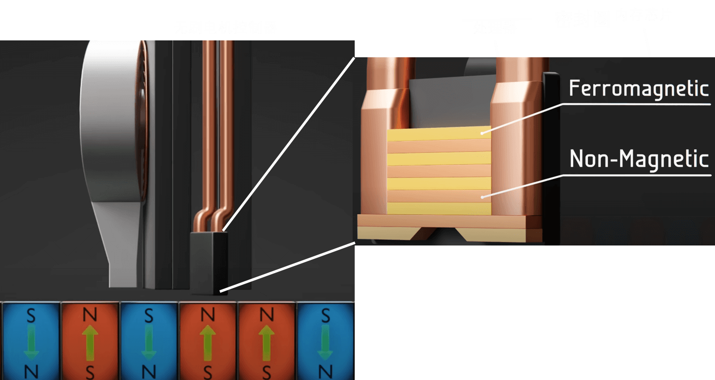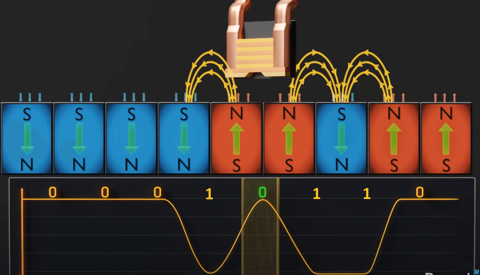 实际的 read head,检测的是相邻两个微块的磁极变化, 这是因为磁极变化的强度比单个微块的磁场强度要大得多,所以这种方式的检测准确率非常高。