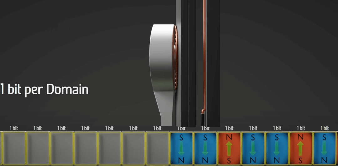 这个磁场沿着 write head 向下,聚焦到尖端的一个小点,改变它正下方的磁盘微块极性