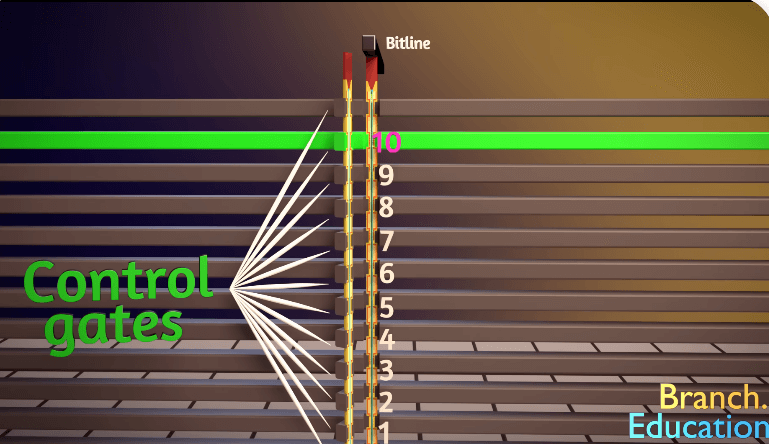 - control gate 控制 String 上的哪个 cell 可以读写数据,此时称为“激活”状态; 如上图所示,读取第 10 层的 cell 信息时,就激活第 10 层的 control gate:
