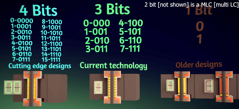 - 较老的技术只能存储2 个不同的电荷级别,即电子很多或很少,