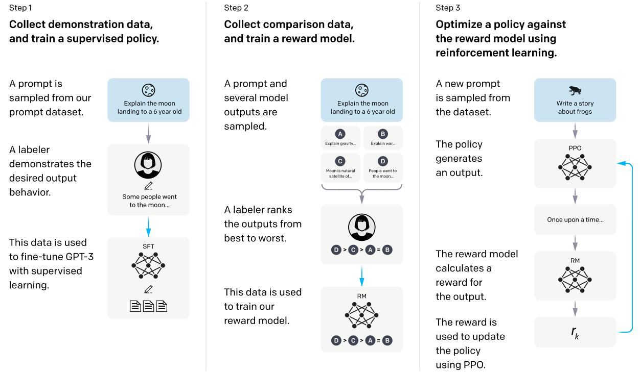 Figure 2: InstructGPT 三部曲:(1) SFT, (2)