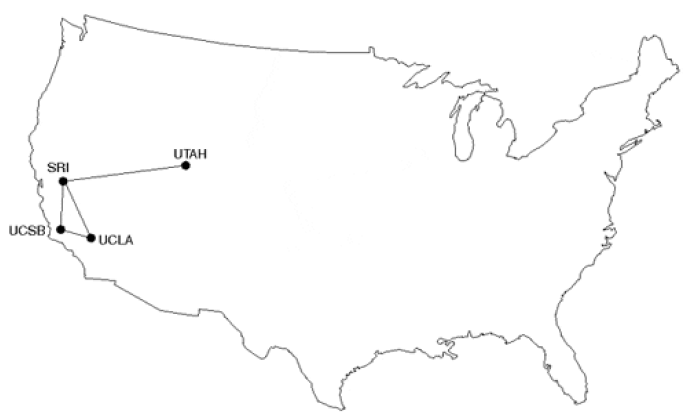1969 年 12 月,四个节点、通过 56kbps 电路连接的试验网络 ARPANET。