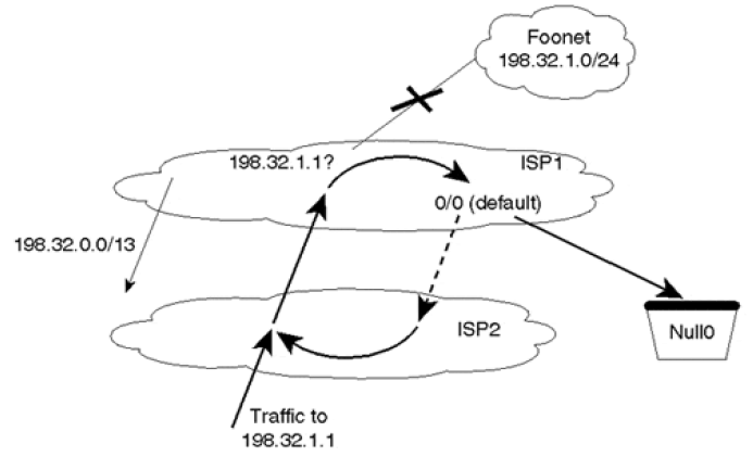 则,当 ISP1 和 Foonet 的网络发生故障之后,目的是 198.32.1.1 的流量从 ISP2 到达 ISP1 时,会匹配到默认路由,流量会绕回 ISP2,形成环路。