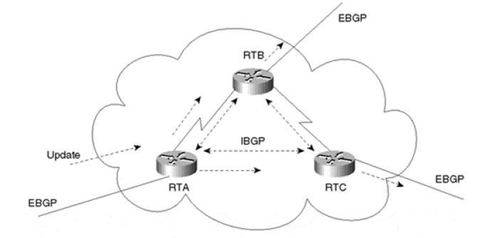 没有 RR 的情况下,同一 AS 内的 BGP speaker 之间形成一个 logical full-mesh。 如图 9-1 所示,虽然 RTA-RTC 之间没有物理链路,但仍然有一条逻辑 peer 链路。