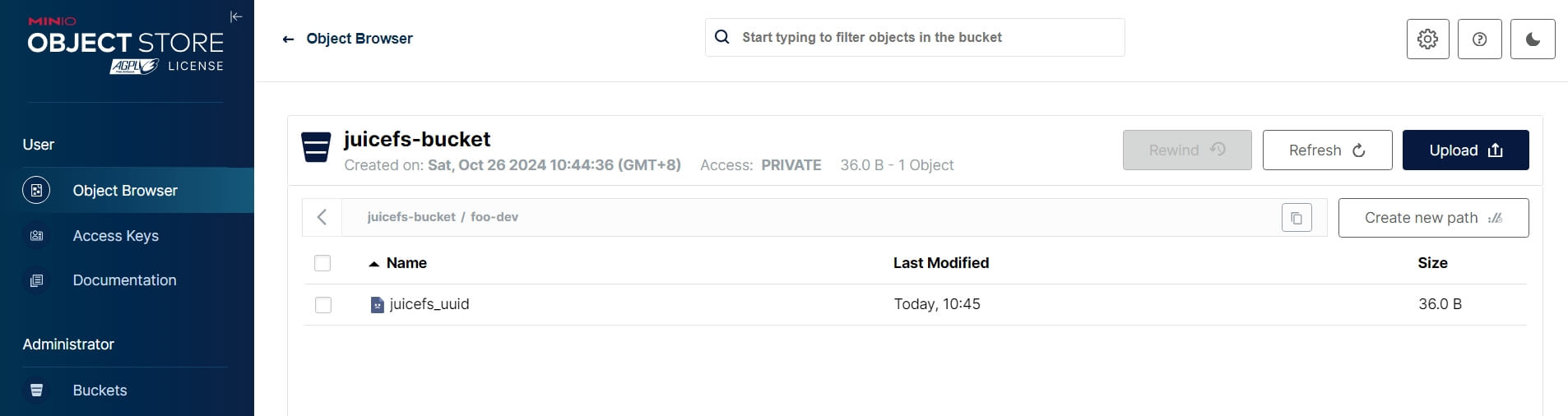2.4.2 查看 MinIO bucket:多了一个 juicefs_uuid 文件