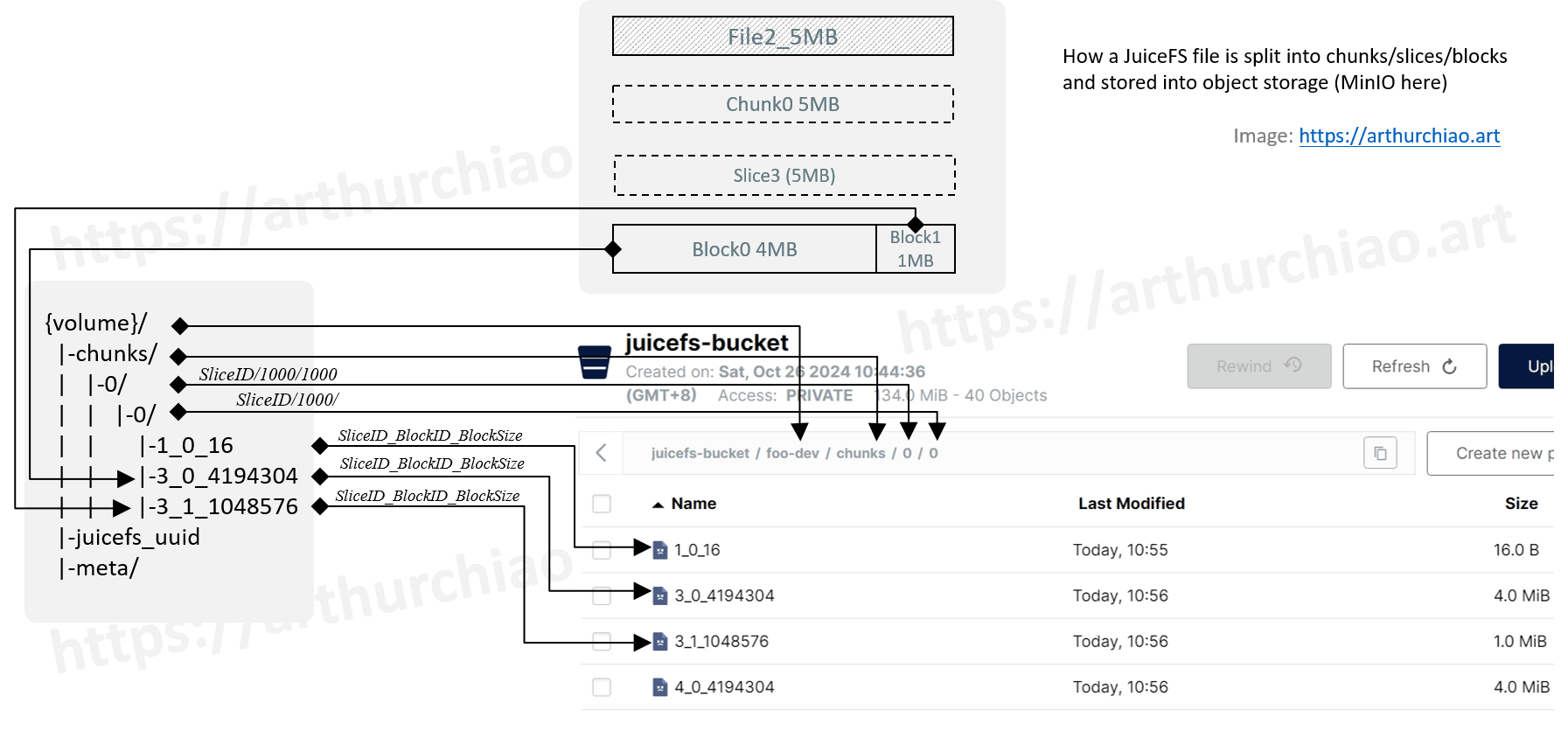 Fig. JuiceFS object key naming and the objects in MinIO.