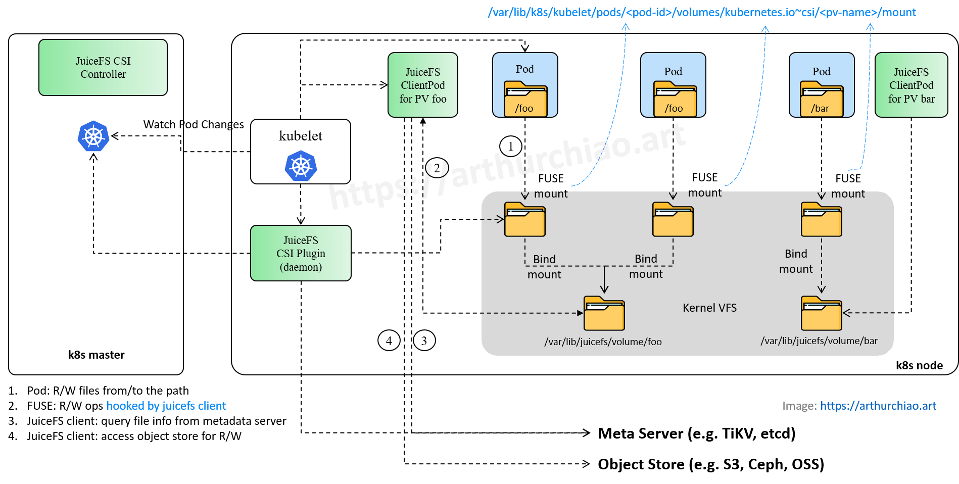 本文从 high-level 梳理了 JuiceFS CSI 方案中,当创建一个带 PV 的 pod 以及随后 pod 读写 PV 时, k8s/juicefs 组件在背后都做了什么,方便快速了解 K8s CSI 机制及 JuiceFS 的基本工作原理。