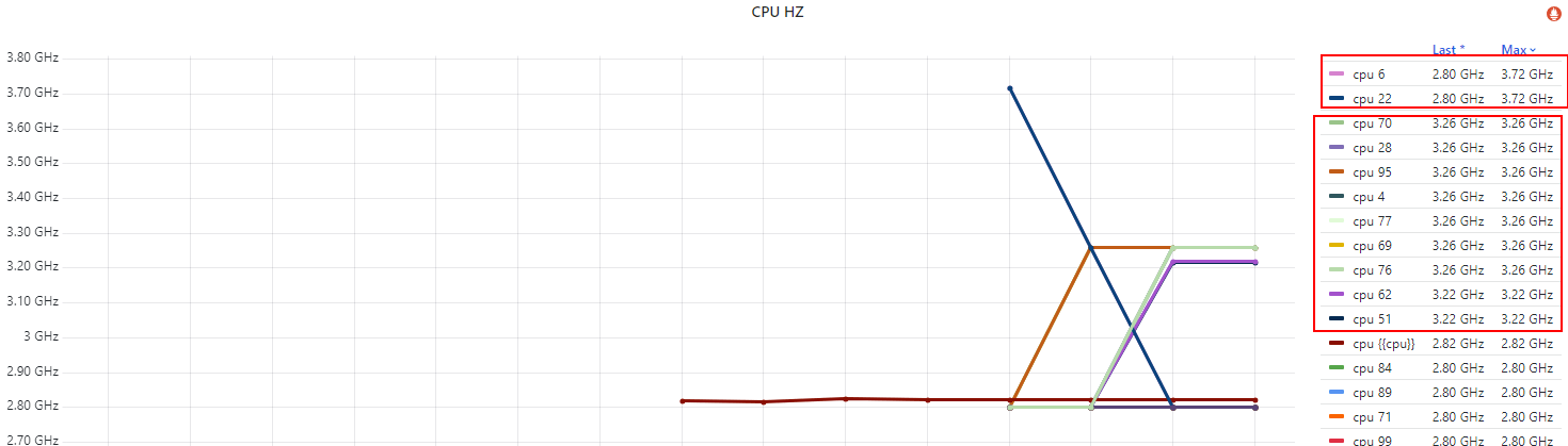 不同厂商设置的 max freq 可能不一样,比如 DELL 设置到了 3.9G(max turbo), 其他两家设置到了 2.8G(all-core turbo),上面监控可以看出来;下面这个图是最大频率和能运行在这个频率的 CORE 数量的对应关系: