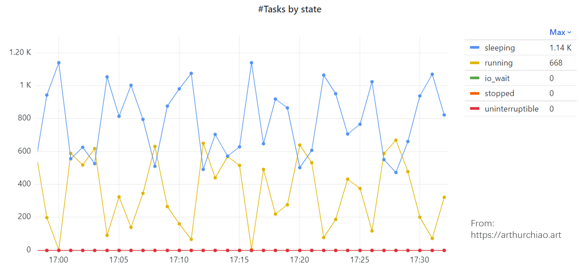 可以看到 running 进程数量在几十到几百之间剧烈波动。这里的 running 和 blocked 数量采集自: