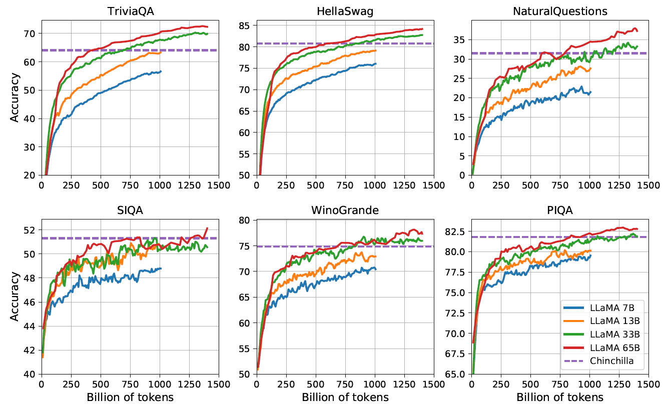 - 对于一个给定的性能要求,训练一个大模型(a large model)可能是一种更便宜的方式; 但对于最终的推理来说,较小的模型+更长的训练时间(a smaller one trained longer)反而更实惠。 例如,Hoffmann 等(2022)建议用 200B tokens 来训练 10B 模型,但我们发现即使在 1T 个 token 之后,7B 模型的性能仍在随着 token 的增多而提高。