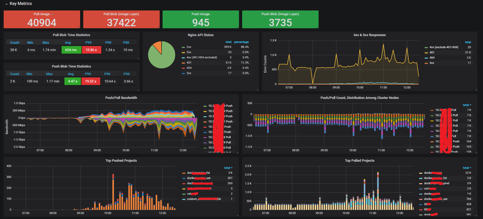 We run a customized image service in our private cloud, which initially based on vmware/harbor 0.4.5, and developed internally since then. A public presentation PDF (in Chinease) has mentioned part of this[2]. This article, however, is not about the design and implementation of the image service (which needs another post), but the monitoring system along with it.