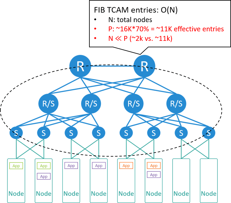 在这种网络方案中,与计算节点规模相关的瓶颈最可能出现在核心交换机,因为要实现 任何两台之间节点之间可达,核心交换机需要占用硬件表项(FIB TCAM)来记录集群内所有 主机的 IP/MAC 信息。