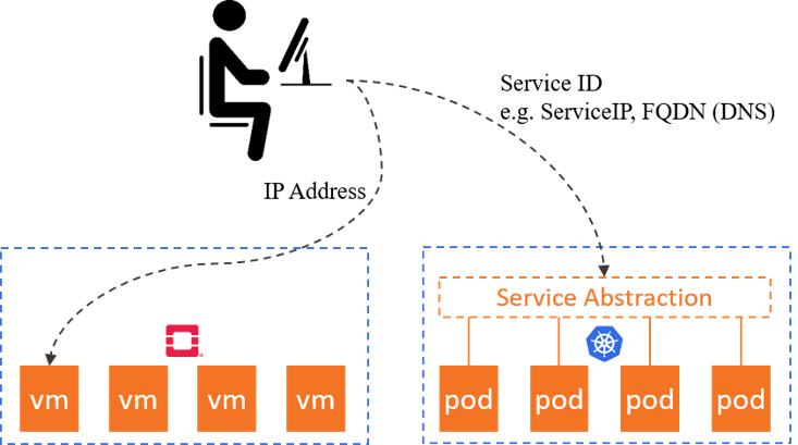 - 而容器平台交付的是服务,例如 k8s 里的 Service,服务屏蔽掉了后面的计算实例的细 节。客户端只需要知道 ServiceIP、ServiceName(DNS 记录)等一些更上层的访问入口。