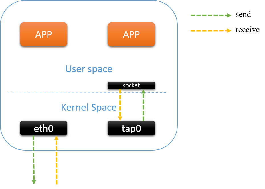 For virtual network devices, such as TUN/TAP, the working process is similar, execpt that the packets a TAP device receives is not from outside, but from the userspace; and the packets a TAP device sends does not go to outside, but goes to userspace.