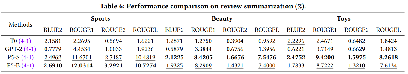 We take Prompts 4-2 and 4-4 to compare P5’s performance with T0 on review preference prediction, as shown in Table 5. We can see that P5-S achieves better RMSE and MAE on Beauty and Toys, while P5-B shows better performance on Sports. Additionally, we take Prompt 4-1 to evaluate P5’s ability on review summarization, as shown in Table 6. For this task, P5-S clearly outperforms T0 and GPT-2 on both Beauty and Toys datasets. It is worth noting that GPT-2 and T0 has 1.5B and 11B parameters, respectively. This shows that P5 can achieve better performances than these competitive baselines with a much smaller model size.