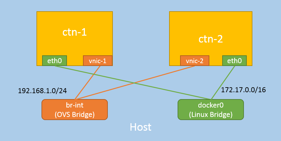 A docker container may need more than one network interfaces (virtual or physical NICs). In this post, we will show how to create OVS internal ports and veth paris, and assign them to containers as vNICs.