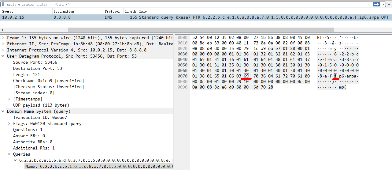 18:49:35.301843 IP 10.0.2.15.45855 > 8.8.8.8.53: 34915+ [1au] PTR? 6.2.2.b.c.e.1.6.a.d.8.a.7.0.1.5.0.0.0.0.0.0.0.0.0.0.0.0.0.8.e.f.ip6.arpa. (113)