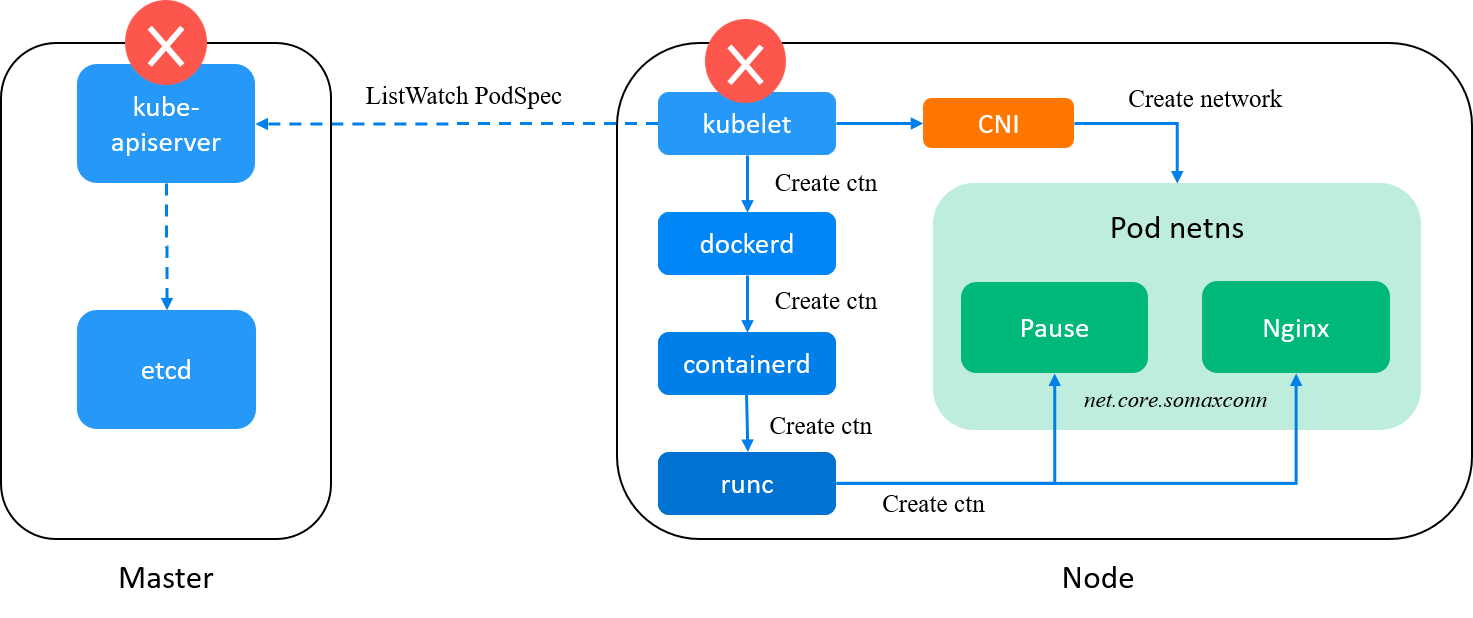 kubelet: watchkube-apiserver, on receiving a new Pod spec, calldockerdto create containers for the Pod (and later call CNI plugins to init pod network); -